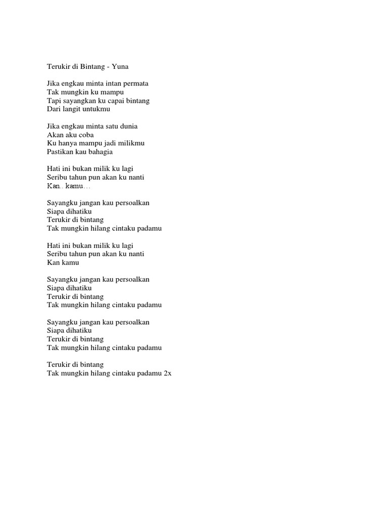 Lirik Lagu Terukir Di Bintang / Jika engkau minta intan permata tak mungkin ku mampu tapi sayangkan ku capai bintang dari langit untukmu jika engkau minta satu dunia akan aku coba ku hanya mampu jadi milikmu pastikan kau bahagia hati ini bukan milik ku lagi seribu tahun pun akan ku nanti kan kamu sayangku jangan kau.. Yuna terukir di bintang unofficial mtv with lyrics. Jika engkau minta intan permata tak mungkin ku mampu tapi sayangkan ku capai bintang dari langit untukmu jika engkau minta satu dunia akan aku cuba ku hanya mampu jadi milikmu pastikan kau bahagia. C sayangku jangan kau persoalkan dm siapa dihatiku dm g terukir di bintang tak mungkin hilang dm g c cintaku padamu. Download lagu terukir di bintang mp3 dan video klip mp4 (3.29 mb) gudanglagu. Sayangku jangan kau persoalkan siapa di hatiku terukir di bintang tak mungkin hilang cintaku padamu.