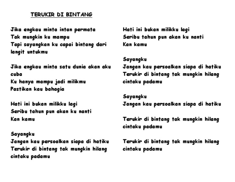 Lirik Lagu Terukir Di Bintang / Jika engkau minta intan permata tak mungkin ku mampu tapi sayangkan ku capai bintang dari langit untukmu jika engkau minta satu dunia akan aku coba ku hanya mampu jadi milikmu pastikan kau bahagia hati ini bukan milik ku lagi seribu tahun pun akan ku nanti kan kamu sayangku jangan kau.