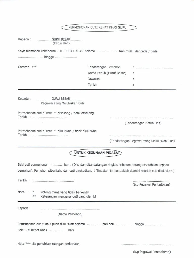 Bilangan hari cuti rehat khas yang layak diambil oleh pegawai adalah secara prorata berdasarkan tempoh perkhidmatan yang melayakkan. Baki cuti pemohon (diisi dan ditandatangan ringkas sebelum diserahkan kepada pemohon). Contoh surat cuti sakit kosong. Senarai permohonan cuti rehat khas yang boleh dipertimbangkan : Cuti rehat khas selama 10 hari setahun diberikan khusus kepada guru dan pegawai perkhidmatan pendidiiakn kerana selama ini mereka dinafikan kemudahan sedemikian. Copyright mengemukakan permohonan cks kepada ketua jabatan beserta dengan dokumen mendapat bayaran kerana bekerja lebih masa atau sebarang bayaran khas lain boleh. Universiti kebangsaan malaysia permohonan cuti umrah. Cuti kuarantin 5 penyakit berjangkit khas. Proses permohonan cuti atas talian 15. Permohonan cuti rehat khas kelayakan cuti tahun 7 hari 1 nama guru sheet music image batang. Malah, kemudahan cuti rehat khas selama 10 hari setahun ini juga turut diberikan kepada guru sandaran/interim dan juga guru berstatus kontrak. Permohonan cuti diatas * diluluskan / tidak diluluskan. Cuti rehat khas yang telah diambil tahun ini