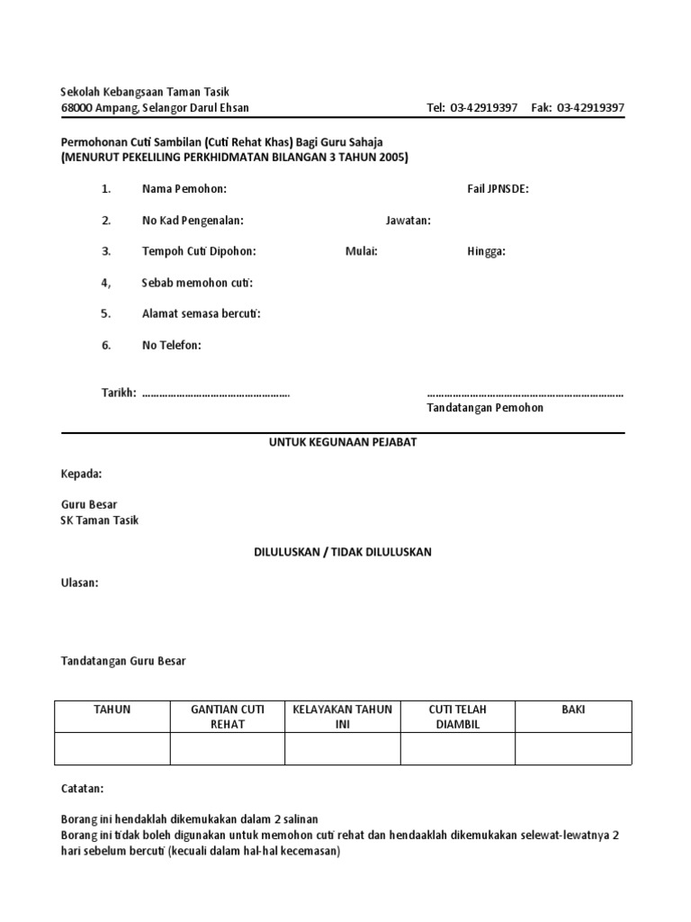 Id.scribd doc 200009837 borang i permohonan cuti. Baki cuti pemohon (diisi dan ditandatangan ringkas sebelum diserahkan kepada pemohon). Pemohon diberitahu dan direkodkan (tindakan ini hendaklah diambil setelah cuti diluluskan). Contoh surat cuti sakit kosong. * potong mana yang tidak berkenaan ** keterangan mengenai cuti yang di ambil. Gantian cuti rehat dikeluarkan oleh jabatan perkhidmatan. Cuti rehat khas kemudahan atau hak panduan pemberian. Permohonan cuti rehat khas kelayakan cuti tahun … hari 7. Penggunaan cuti rehat dan cuti rehat khas ini amat berbeza sekali. Undang undang buruh cuti tahunan dulu lain sekarang lain. Cuti rehat khas kemudahan atau hak panduan pemberian. Ia diberi kepada pegawai perkhidmatan pendidikan untuk menggantikan cuti sambilan. Diluluskan pada / mulai daripada 5 bil.