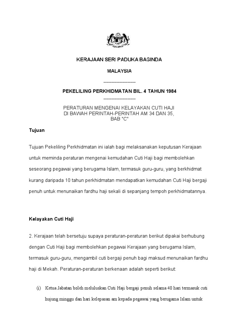 Pekeliling Cuti Menunaikan Haji / (a) cuti haji boleh diluluskan kepada anggota beragama islam yang berjawatan tetap dan telah disahkan dalam jawatan.. Menunaikan ibadah haji ke tanah suci mekkah merupakan kewajiban yang melekat pada setiap pemeluk agama islam di dunia. (g) menunaikan fardhu haji sekiranya tempoh 40 hari tidak mencukupi; Bagi pemohon berstatus kontrak, hanya layak memohon cuti haji sekali sahaja sepanjang perkhidmatan di ums. Pekeliling cuti rehat khas crk 10 hari sumber pendidikan. 13 aturan penting lain yang perlu diperhatikan berkaitan dengan pekerja yang hendak menunaikan ibadah haji adalah sebagaimana diatur dalam pp no.